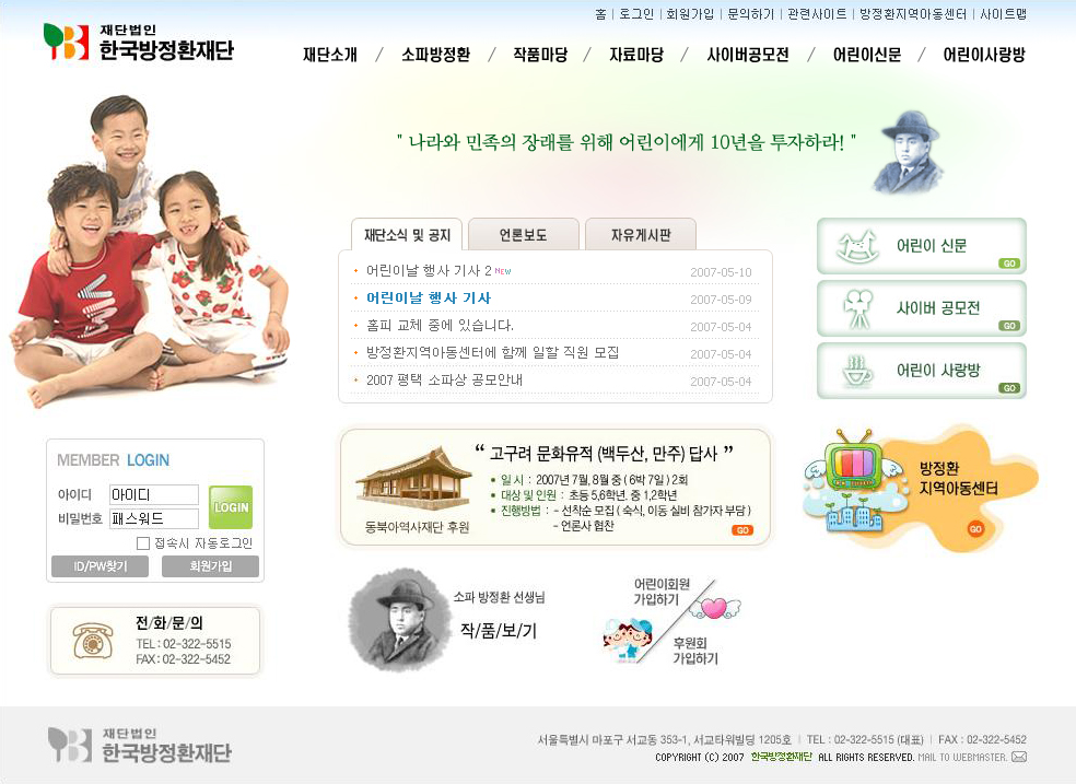 고급형 | 한국방정환재단 페이지 정보 작성자 : 이월선쪽지보내기 메일보내기 자기소개 아이디로 검색 전체게시물쪽지보내기 메일보내기 자기소개 아이디로 검색 전체게시물 작성일 : 07-05-10 18:33 조회 : 1,750회 댓글 : 0건 관련링크 : http://www.korsofa.org 342회 연결 본문 소파 방정환 선생님의 어린이사랑, 청소년 사랑의 빛나는 업적을 추모, 계승, 선양하는 여러가지 기념사업을 하기 위해 설립된 한국방정환재단 사이트가 작업 완료 되었습니다. 댓글목록 등록된 댓글이 없습니다. 이전글 다음글 목록