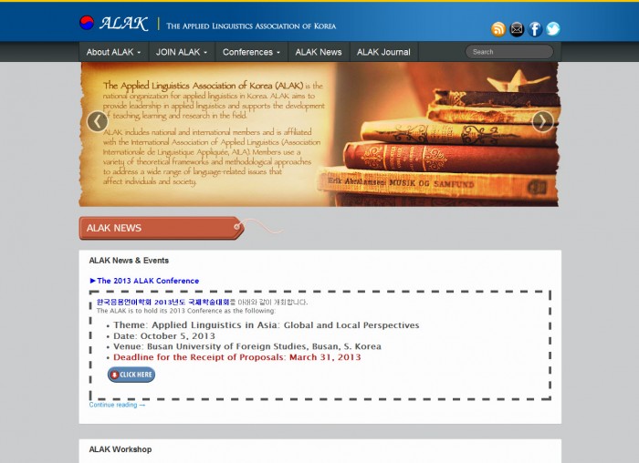 사회단체 | 한국응용언어학회 페이지 정보 작성자 : 바다아저씨쪽지보내기 메일보내기 홈페이지 자기소개 아이디로 검색 전체게시물쪽지보내기 메일보내기 홈페이지 자기소개 아이디로 검색 전체게시물 작성일 : 13-02-20 16:13 조회 : 839회 댓글 : 0건 본문 한국응용언어학회 홈페이지입니다. 워드프레스를 사용해서 제작한 사이트입니다. 학회에서 운영하는 학회 저널 사이트도 별도의 워드프레스를 사용해서 제작했습니다. 댓글목록 등록된 댓글이 없습니다. 이전글 다음글 목록