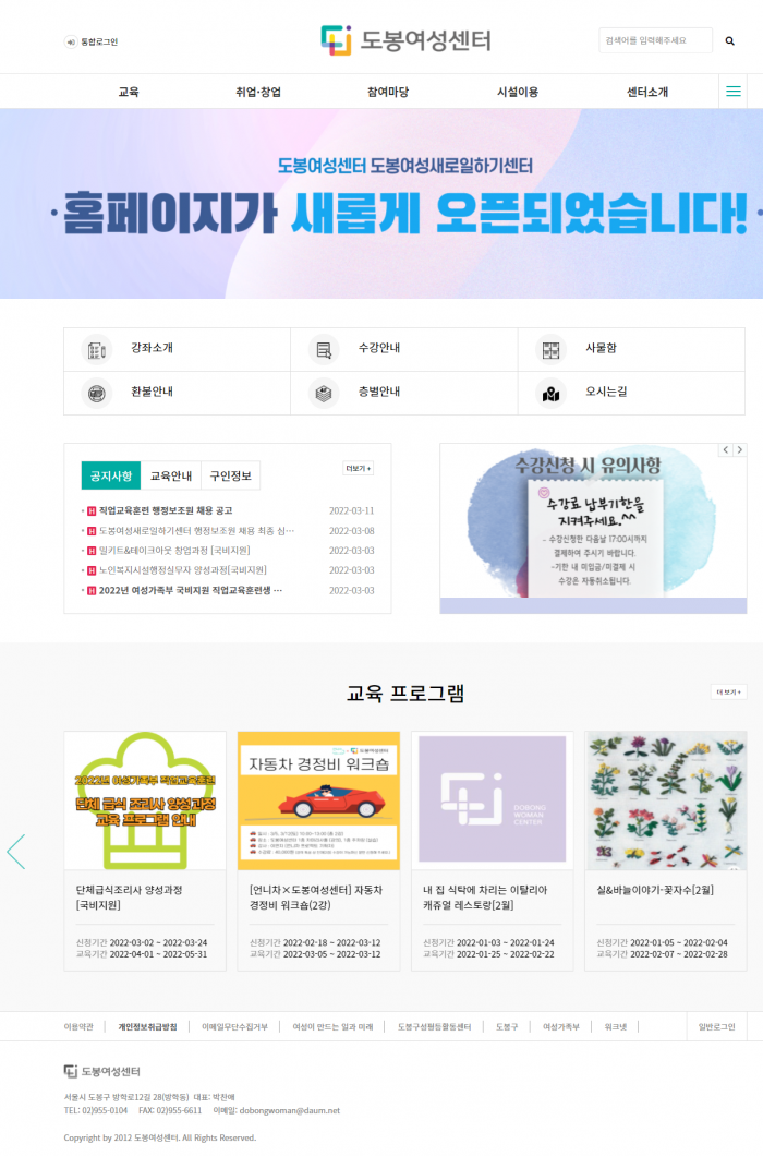 사회단체 | 도봉여성센터 리뉴얼 페이지 정보 작성자 : 바다아저씨쪽지보내기 메일보내기 홈페이지 자기소개 아이디로 검색 전체게시물쪽지보내기 메일보내기 홈페이지 자기소개 아이디로 검색 전체게시물 작성일 : 22-03-17 15:49 조회 : 222회 댓글 : 0건 본문 도봉여성센터 홈페이지를 전면적으로 리뉴얼했습니다. 내부의 각종 프로그램들과 기존 홈페이지에서 지원되지 않던 모바일 결제지원까지 반응형으로 제작했습니다. 댓글목록 등록된 댓글이 없습니다. 이전글 다음글 목록